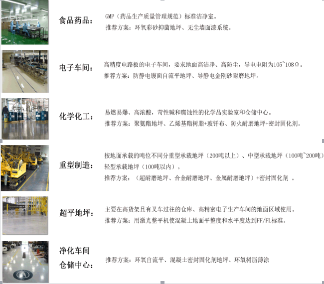 根據(jù)材料及施工工藝可分為:干撒式耐磨地坪(金剛砂)、液體耐磨地坪(混凝土密封固化劑)、環(huán)氧樹(shù)脂地坪、聚氨酯耐磨彈性地坪、乙烯基重防腐等。